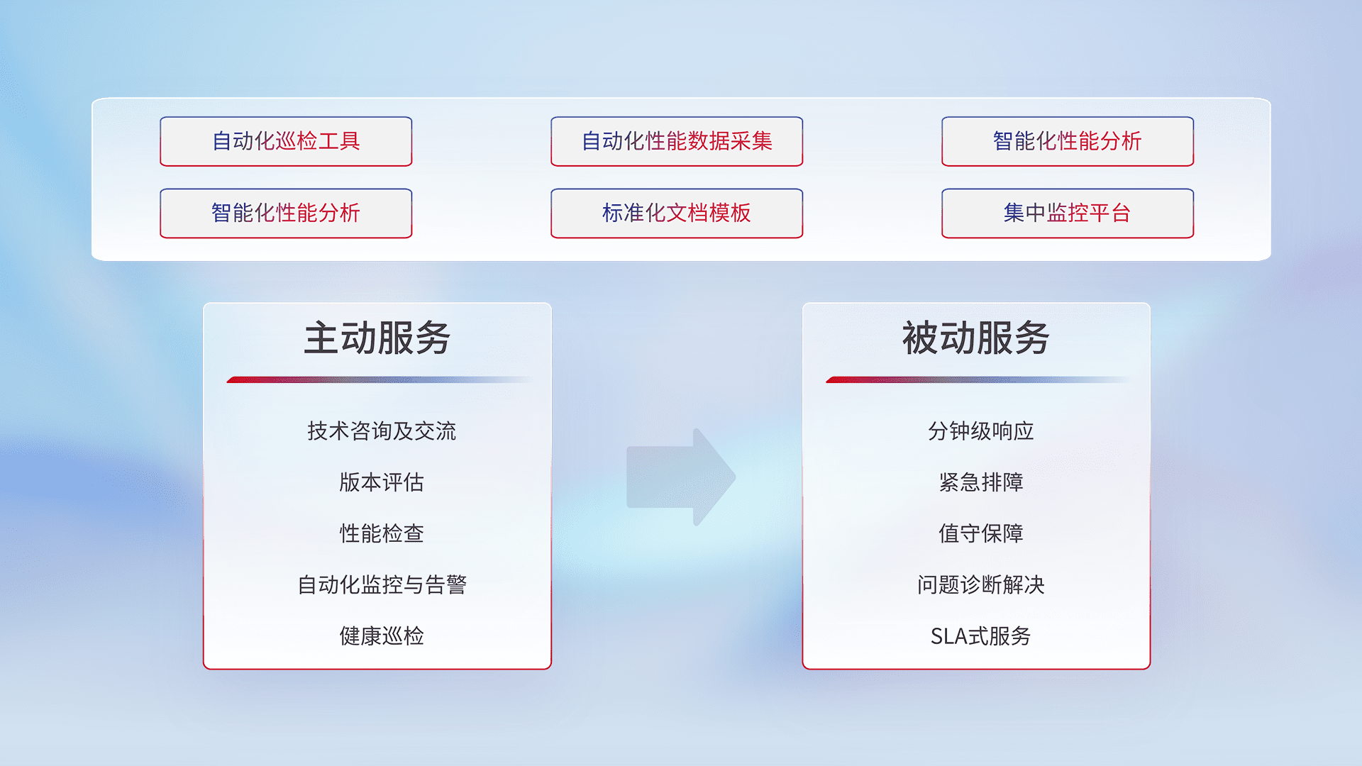 智能化工具和标准化文档,,保障服务质量,,提供主动服务(包含技术咨询、、、、版本评估、、、性能检查、、自动化监控与告警、、、、健康巡检)和被动服务包含(分钟级响应、、、紧急排障、、、值守保障、、问题诊断解决、、SLA服务)。。。。